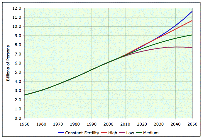The United Nations revised population projections in 2002, indicating new low, medium, and high range estimates in Figure 1. The most conservative estimate predicts 7.68 billion people by the year 2050. The mid-range estimate is set at 9.08 billion people, and the highest estimate is that 10.65 billion people will inhabit the earth by 2050. At the medium estimate, there will be an increase of about 2.6 billion people between 2005 and 2050 (from 6.46 billion to 9.08 billion).No matter the signs of imminent peril, we always imagine some scientific revolution coming to save the day in lieu of a God who has surely abandoned us.